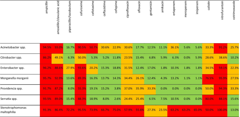 - Numbers refer to the percentage of resistant isolates of a pathogen to a particular antibiotic during the study period. Colour coding: green = resistance rate < 20%; yellow = resistance rate 20–50%; red = resistance rate > 50%
